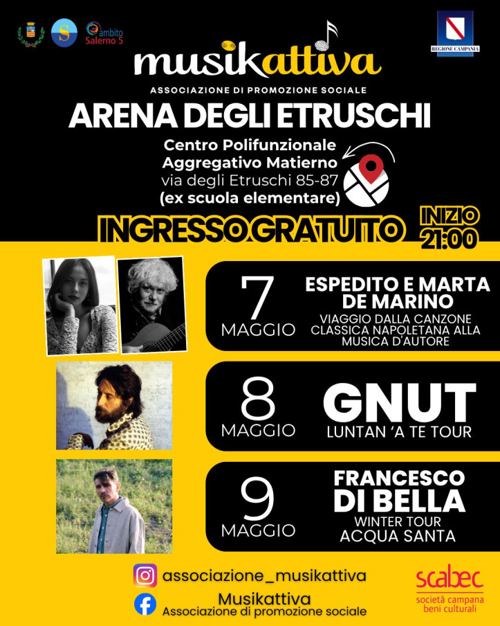 Sarà presentata giovedì 30 aprile 2026 alle ore 10.30, presso il Centro Polifunzionale Aggregativo di Matierno, la nuova edizione de l’Arena degli Etruschi, la rassegna musicale che animerà la città di Salerno.