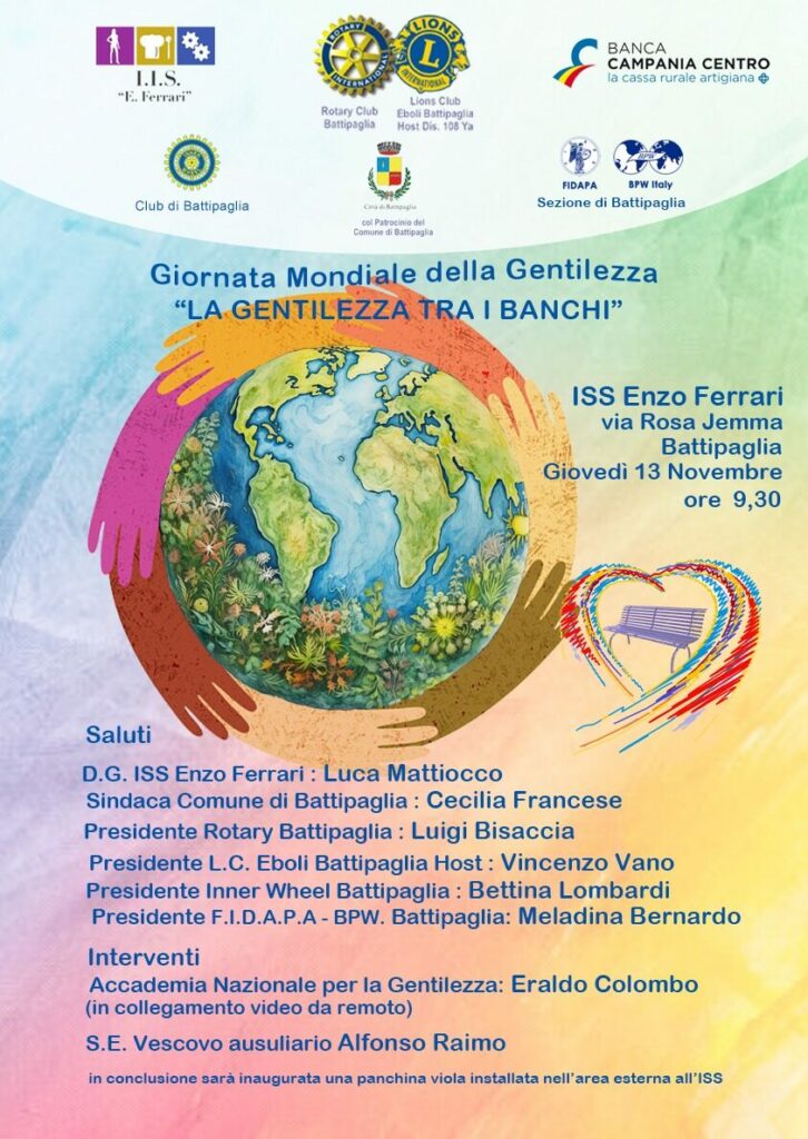 In occasione della Giornata Mondiale della Gentilezza, l’Istituto di Istruzione Superiore “Enzo Ferrari” di Battipaglia ospiterà l’evento dal titolo “La Gentilezza tra i banchi”, un’iniziativa dedicata alla diffusione della cultura del rispetto, della solidarietà e dell’empatia tra i giovani. L’appuntamento, organizzato con il patrocinio del Comune di Battipaglia e in collaborazione con Rotary Club Battipaglia, Lions Club Eboli Battipaglia Host, Inner Wheel Battipaglia, F.I.D.A.P.A. – BPW Italy sezione di Battipaglia e Banca Campania Centro, si terrà giovedì 13 novembre alle ore 9.30 presso la sede dell’istituto in via Rosa Jemma.