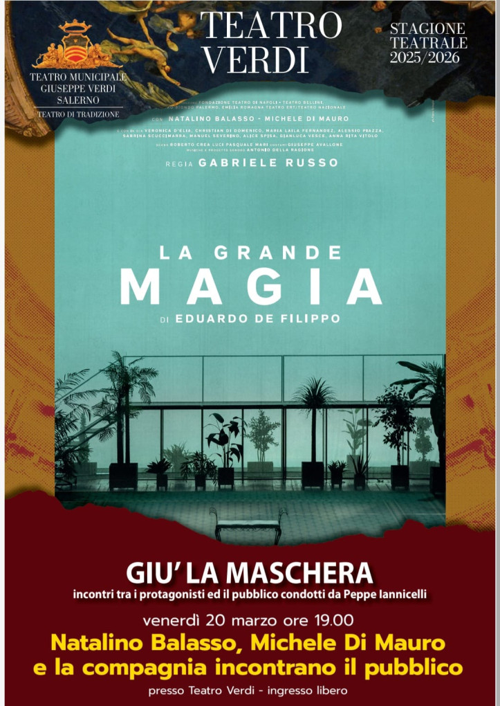 Un appuntamento speciale per gli amanti del teatro. Venerdì 20 marzo alle ore 19.00, nel foyer del Teatro Municipale Giuseppe Verdi di Salerno, si terrà l’incontro “Giù la maschera”, momento di confronto tra pubblico, stampa e cast dello spettacolo La grande magia di Eduardo De Filippo.