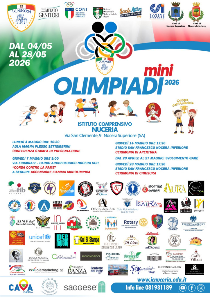 A Nocera Superiore maggio fa rima con MiniOlimpiadi. È ormai agli sgoccioli il countdown per l’edizione 2026 del grande evento sportivo promosso dall’Istituto Comprensivo Nuceria, diventato negli anni un appuntamento fisso della primavera nella città del Battistero.